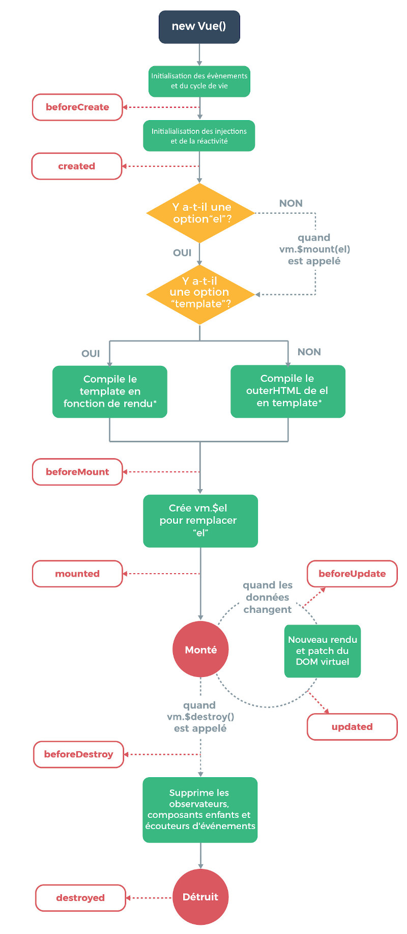 Une instance de vue suit ce que l'on appelle un cycle de vie. C’est-à-dire que le framework va passer par différentes étapes lors de l'exécution de votre script, et chaque étape pourra être détectée via des sortes d’événements propres à Vue. Cela peux s'avérer pratique pour exécuter selon différentes étapes du cycle d'exécution de votre application.