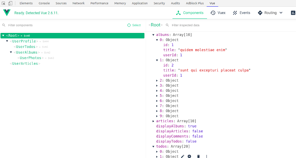 Il existe un plugin pour navigateur qui permet de travailler plus efficacement avec VueJS. Le DevTools de Vue est optimisé, et va vous permettre de gagner du temps dans votre développement. Il permet l'affichage "user-friendly" de vos données, instances, composants, événements, etc... Ce qui vous permet de visualiser le comportement de votre appli sans faire trop de console.log et offre un certains confort durant les phases de développement.