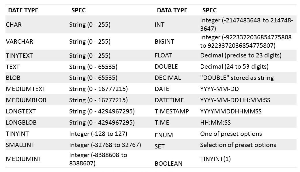 - Text : pour de long texte (65535 caractère), et toutes ses variantes (tinytext, mediumtext, longtext), comme les entiers.