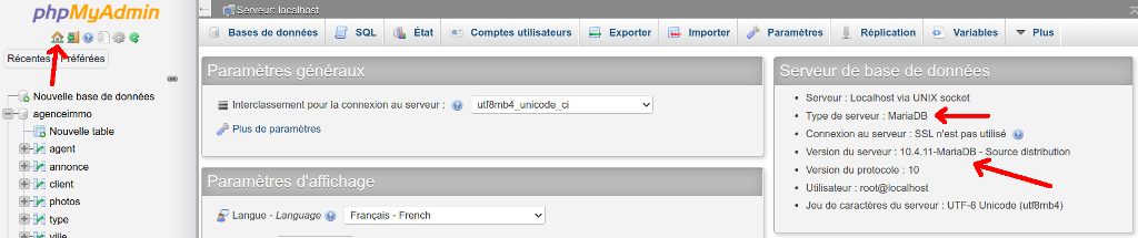 Important : cet exemple a été réalisé avec MariaDB. Pour faire la même chose avec MySQL, il vous faudra créer un index sur votre champ ville_id avant de créer la clé étrangère. Pour vérifier quel SGBDR est installé sur votre ordinateur, allez dans la page d'accueil de phpMyAdmin :