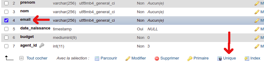 Voici comment mettre un champ en UNIQUE dans phpMyAdmin (onglet structure) :