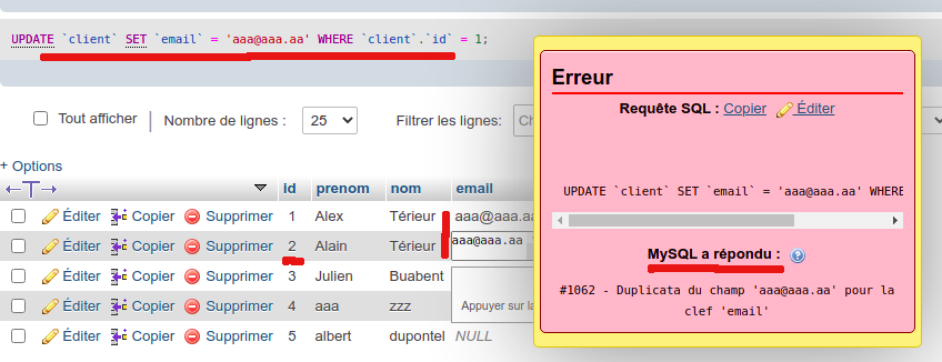 Et voici un exemple de "mauvaise manip", si on essaye de mettre deux fois le même email à deux clients différents :