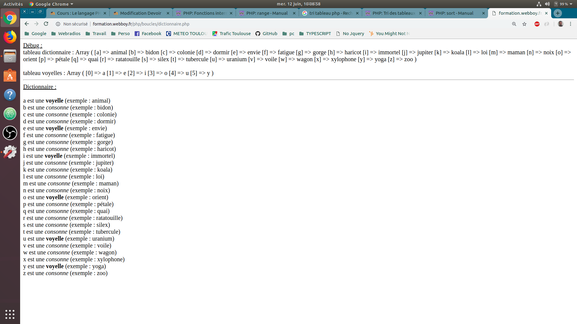 Dans cet exercice, on va créer un script qui va nous dire si une lettre est une voyelle ou une consonne, et qui va nous donner un exemple de mot pour chaque lettre. Vous pouvez utiliser un foreach() pour cela.