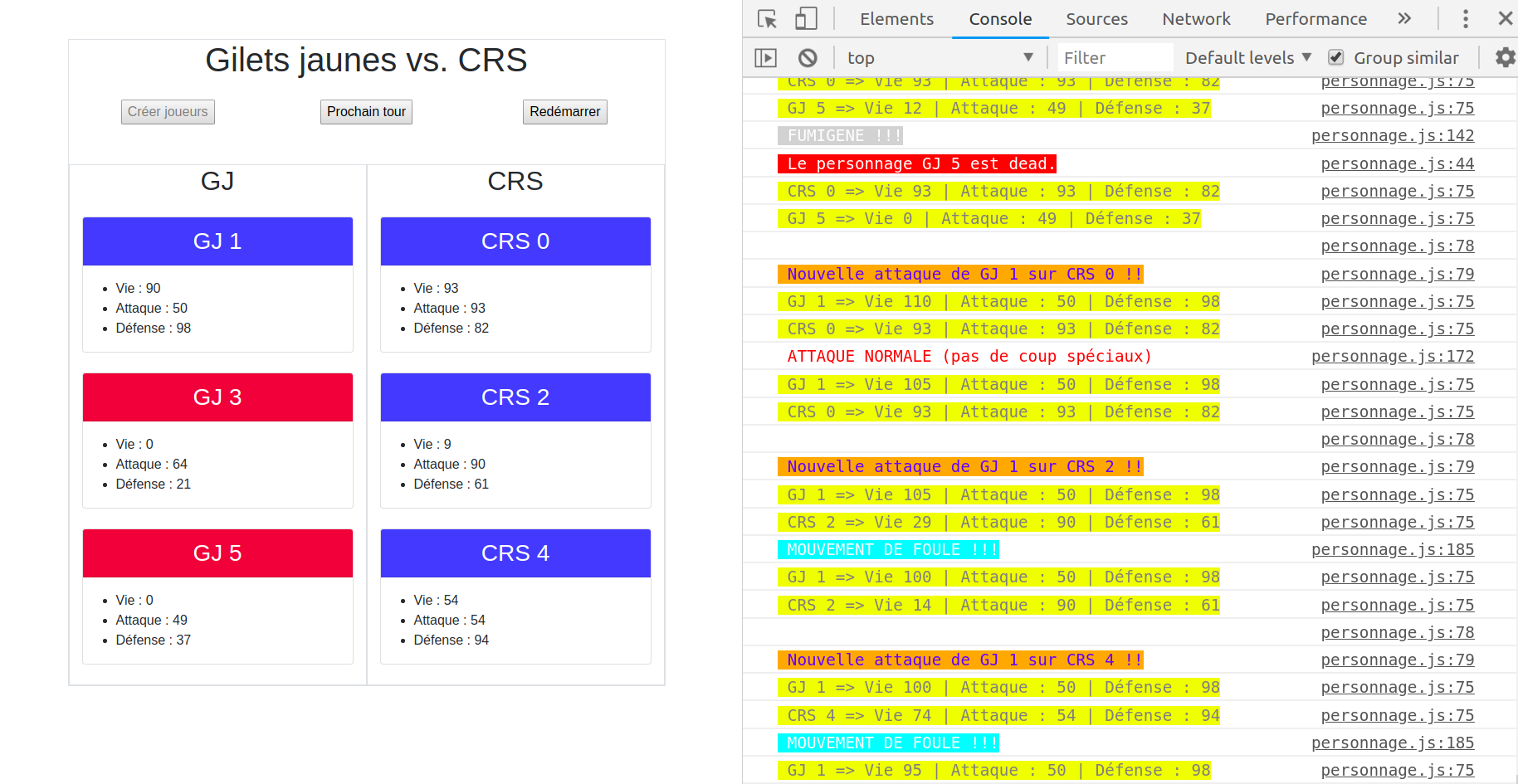 - tester votre code. Statistiquement, pour l'instant les CRS l'emporte le plus souvent (car on a pas encore fait les coups spéciaux des GJ)