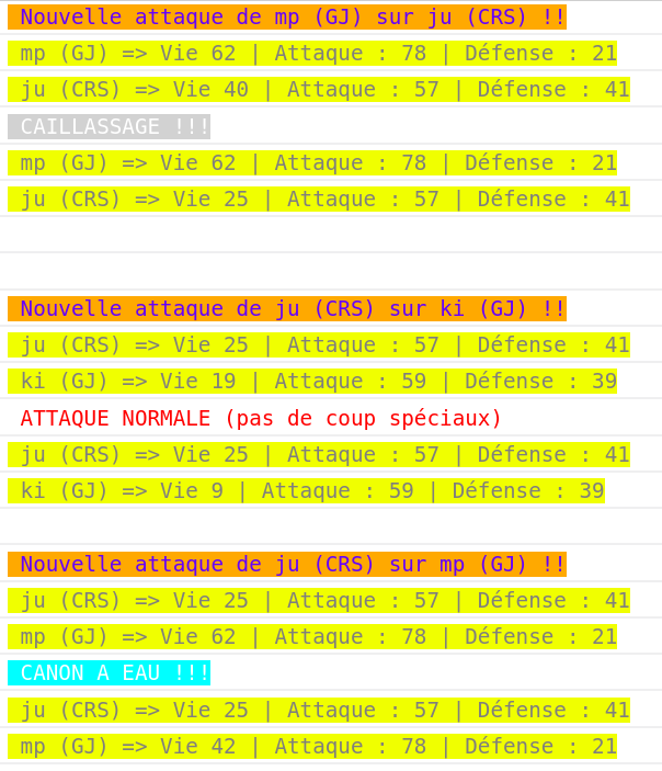 - faites des beau console log pour chaque attaque afin que l'évolution des personnages et des actions soit bien lisible