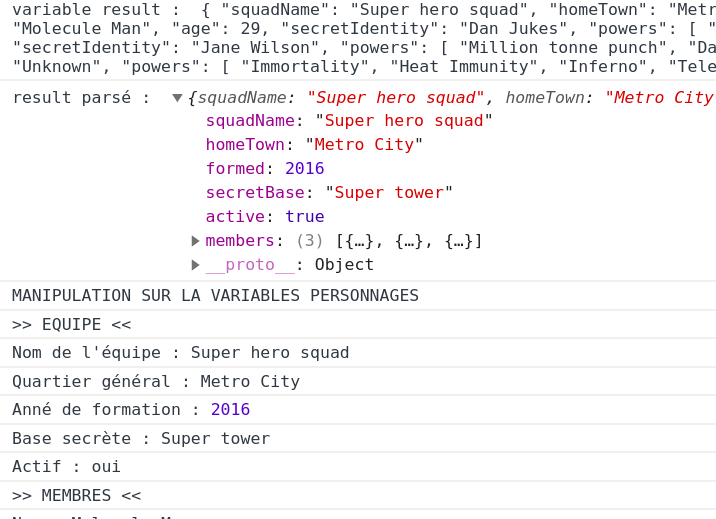 Votre mission, si vous l'acceptez, sera de transformer cette chaîne de caractère en une variable utilisable en JS. Une fois que c'est fait, manipuler votre variable JS pour afficher son contenu correctement dans votre console, comme ceci :