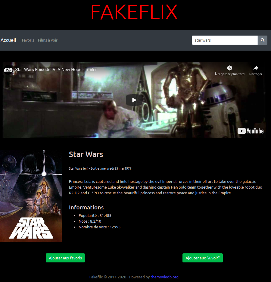 Cette page est le détail d'un film (affiche, synopsis, stats, etc...). Outre les données standard du film, elle contient trois fonctionnalités supplémentaires :